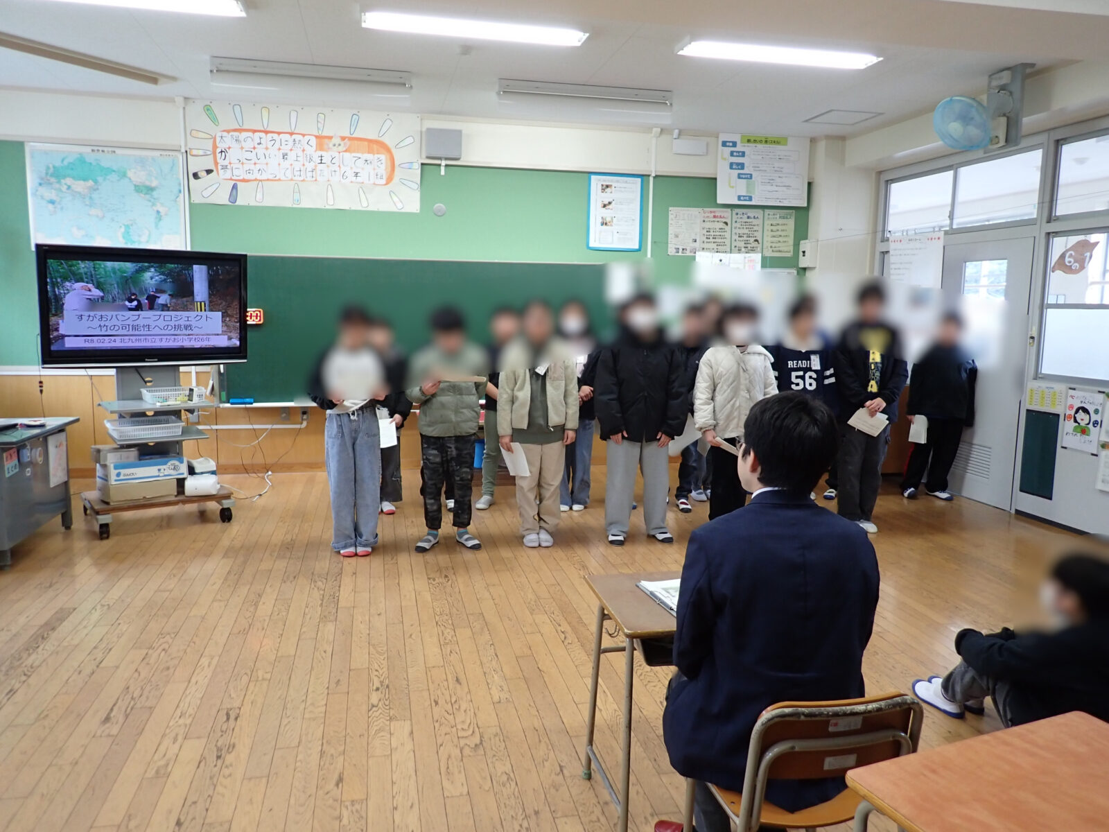 6年生の皆さんは、竹林問題の背景にある社会的な要因から、その解決策として地域を巻き込んだ「竹まつり」開催まで、多角的な視点で発表してくれました。そして、その解決策として、既に実施済みの「すがお竹まつり」の成功体験を元に、「バンブーフェスティバル」という北九州市全体を巻き込む壮大な提案をしてくれました。竹の良さや問題点を知ってもらい、地域の人々が「自分たちも何かしたい」と思えるようなイベントの開催は、私たちもぜひ実現したいと強く思いました。
